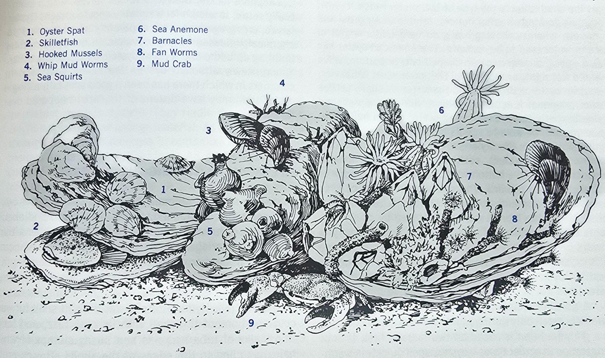 So, Oysters build reefs or bars. The hard surface of Oyster shells and the nooks between the shells provide places for all sorts of marine life. Some of the animals live on the Oyster shells, some attach to the shells, some live in the shell itself. Worms, sponges, and mud crabs are plentiful. Grass shrimp, amphipods, bryozoans, anemones, barnacles, oyster drills, hooked mussels, and red beard sponge. Many of these serve as food for larger animals including striped bass, weakfish, black drum, croakers, and blue crabs.