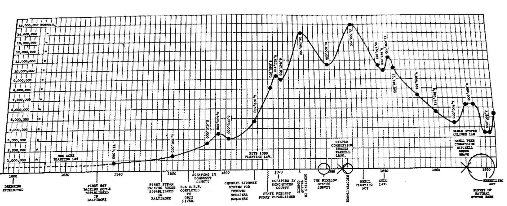 The highest harvest was in 1885 —15 million bushels. In 1892, 11,633,000 bushels were harvested in Maryland, and 5,985,0000 in Virginia. There was what seemed to be a limitless abundance of Oysters.